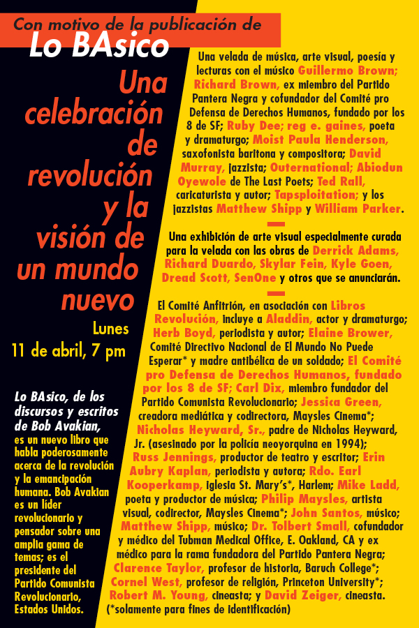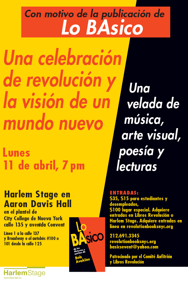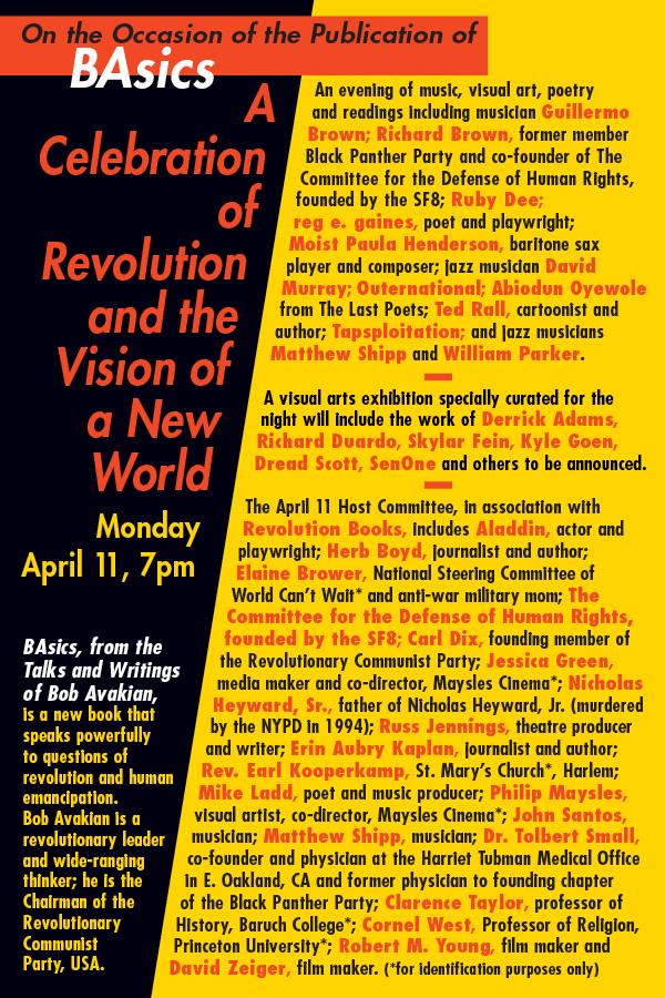 BAsics is a new book of quotes and essays from Bob Avakian, Chairman of the Revolutionary Communist Party, USA. April 11, in Harlem, will see a night of music, visual art, poetry and readings celebrating revolution and the vision of a new world, marking the occasion of this book's publication.